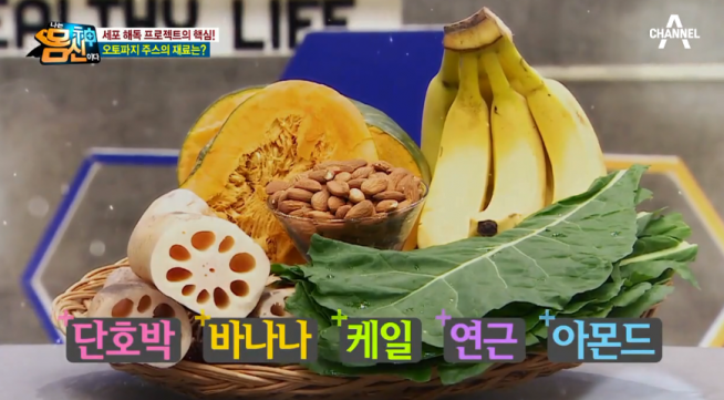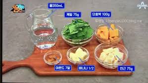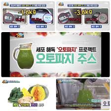 오토파지 주스 만드는 법은 믹서기에 연근 100g, 단호박 75g, 케일 75g, 바나나 1/2개, 아몬드 7알, 물 350ml를 넣어 갈아준다. 연근, 단호박은 익혀 사용해도 된다. 한달에 25일은 일반식, 5일~7일은 오토파지 주스 섭취한다.