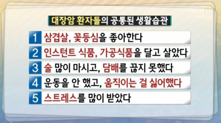 대장암은 어느날 갑자기 생기는것이 아니라 평소 생활 습관의 영향으로 용종이 암으로 변해가는 경우가 많은데요, 어리면 20대부터 발병하기도합니다. 보통 40대부터는 대장암 발병을 주의해야해서 대장내시경을 주기적으로 하는것이 좋습니다.