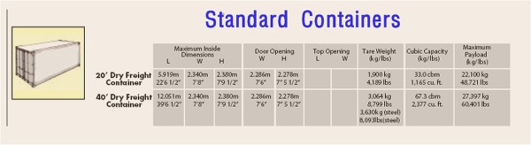 가장 일반적인 것으로 사이즈는 20FT, 40FT, 40FT HC로 나뉘어져 있습니다. 내부치수의 길이, 폭, 넓이 또한 다 기준이 다르며 개구부 치수도 다릅니다.