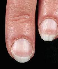 손톱에 흰 반점이나 하얀 가로줄이 나타나는 경우 아연 부족을 의심해봐야 한다고 한다. 아연은 체내 단백질의 합성 능력과 세포 생성 능력을 높이는 역할을 하기에 단백질로 이루어진 손톱을 형성하는 데 중요한 역할을 한다. 아연이 부족하면 손톱이 비정상적으로 발달해 흰 반점이나 흰 가로줄이 나타나게 된다고 한다. 아연은 땀으로 배출되기 때문에 땀이 많은 사람은 균형잡힌 식단으로 아연을 보충해줘야 한다고 한다.